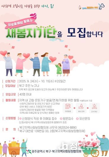 ‘새봄지기단’은 북구 주민 누구나 참여할 수 있으며 관심 있는 주민은 북구 지역사회보장협의체 누리집을 참고해 신청서를 이메일 또는 방문 접수하면 된다.