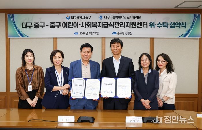 정안뉴스 안정주 기자 | 대구 중구는 지난달 25일 대구가톨릭대학교 산학협력단과 ‘중구 어린이·사회복지 급식관리지원센터 위탁 운영’ 협약을 체결했다.