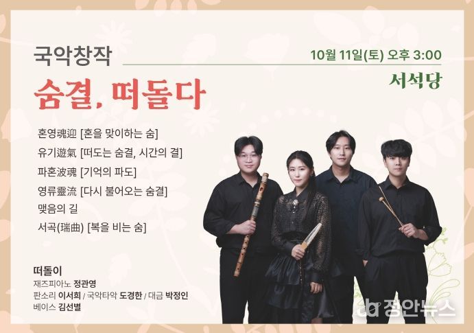 정안뉴스 안정주 기자 | 광주문화재단(대표이사 노희용) 전통문화관은 오는 10월 11일 오후 3시, 토요 상설공연 22회차로 퓨전국악 단체 떠돌이의 '숨결, 떠돌다' 무대를 선보인다.