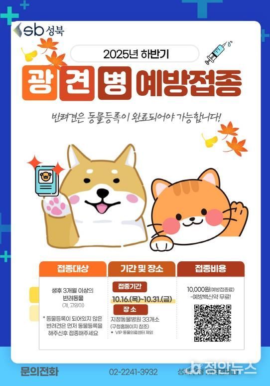 정안뉴스 안정주 기자 | 서울 성북구가 10월 16일부터 31일까지 16일간 가을철 광견병 예방접종을 실시한다.