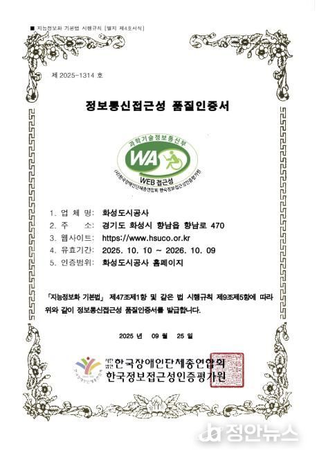 정안뉴스 안정주 기자 | 화성도시공사는 시각장애인, 고령자 등 정보 취약계층도 불편 없이 홈페이지를 이용할 수 있도록 지속적으로 개선해온 결과, 3년 연속 ‘웹 접근성 품질인증마크’를 획득했다고 10일 밝혔다.