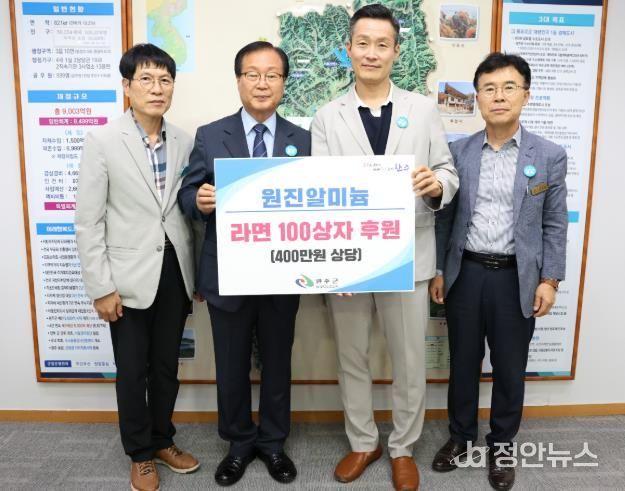 정안뉴스 안정주 기자 | ㈜원진알미늄이 완주군에 라면 100상자(환가액 400만 원 상당)를 전달했다.