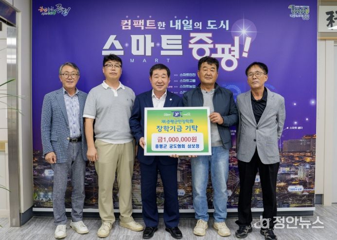 정안뉴스 황은경 기자 | 충북 증평군 궁도협회 ‘삼보정’(회장 최준경)은 10일 군청을 찾아 지역의 우수 인재 양성을 위해 써달라며 (재)증평군민장학회에 장학금 100만원을 기탁했다.