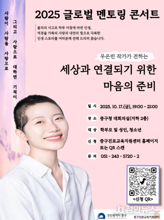 정안뉴스 황정혜 기자 | 부산 중구는 중구 진로교육지원센터 주관으로 오는 10월 17일 오후 7시, 중구청 지하2층 대회의실에서 '2025 글로벌 멘토링 콘서트'를 개최한다.