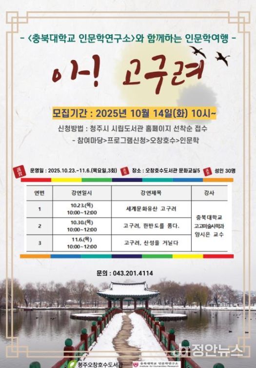 정안뉴스 황은경 기자 | 청주오창호수도서관은 충북대학교 인문학연구소와 협력해 청주시민의 인문 소양 증진을 위한 인문학 강좌 ‘인문학 여행 : 아! 고구려’를 오는 23일부터 운영한다.