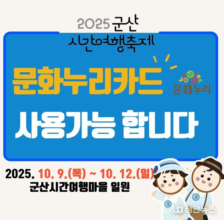 정안뉴스 안정주 기자 | 군산시가 12일까지 열리는 '2025 군산시간여행축제' 기간 동안 통합문화이용권(문화누리카드) 임시 가맹점을 운영해 시민들이 축제 현장에서 더욱 쉽고 편리하게 통합문화이용권(문화누리카드)를 사용할 수 있도록 지원했다.