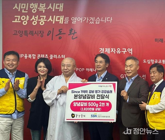 정안뉴스 안정주 기자 | ㈜전한의 외식브랜드 강강술래(대표 노상환)가 10월 10일, 고양특례시에 본양념갈비 500g 2,000개(2,820만 원 상당)를 기탁했다. 이번 전달식은 고양특례시청 열린시장실에서 진행됐으며, 이동환 고양특례시장, 김민숙 고양특례시의원(고양, 관산, 원신), 노상환 강강술래 대표, 김응화 고양시사회복지협의회 회장이 함께 자리했다.