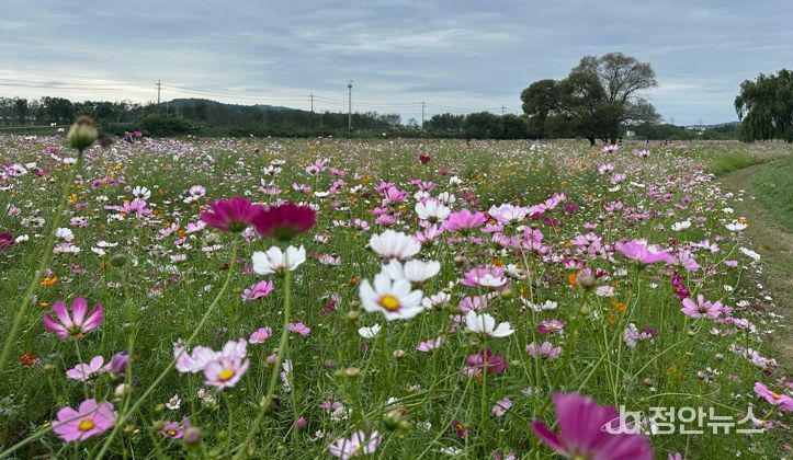 정안뉴스 황은경 기자 | 청주시 무심천이 가을빛 코스모스로 물들고 있다.