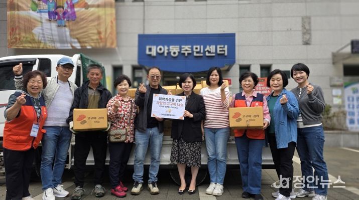 정안뉴스 안정주 기자 | 시흥시 대야동 통장협의회는 지난 10월 10일 대야동 주민센터에서 지역 취약계층을 위한 고구마 40상자(500kg) 전달식을 열었다. 이번 나눔은 지역 사회 돌봄의 공백을 줄이고, 따뜻한 명절 분위기를 어려운 이웃들과 나누기 위해 마련됐다.