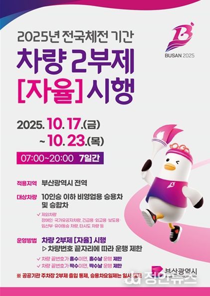 정안뉴스 황정혜 기자 | 부산시는 제106회 전국체전 기간을 맞아, 내일(14일) 오전 8시부터 서면교차로에서 교통공사, 버스조합 등 120여 명과 함께 '전국체전 기간 차량 2부제(자율) 참여와 대중교통 이용 홍보'를 위한 거리 캠페인을 펼친다고 밝혔다.
