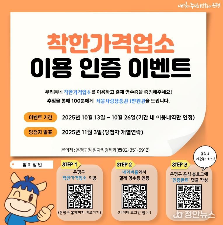 정안뉴스 안정주 기자 | 서울 은평구는 지역 경제 활성화와 물가 안정 분위기 조성을 위해 13일부터 오는 26일까지 2주간 ‘착한가격업소 이용 인증 이벤트’를 진행한다고 밝혔다.
