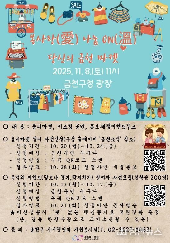 정안뉴스 안정주 기자 | 금천구는 오는 11월 8일 금천구청 광장 앞에서 ‘봉사랑(愛) 나눔ON(溫), 당신의 금천마켓’을 연다고 밝혔다.
