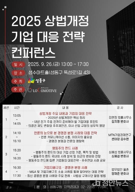 정안뉴스 안정주 기자 | 서울 성동구는 지난달 26일 성수타운매니지먼트(Seongsu Town Management) 사업의 일환으로 진행된 '2025 상법개정과 기업의 대응전략' 컨퍼런스를 성공적으로 마쳤다고 밝혔다.