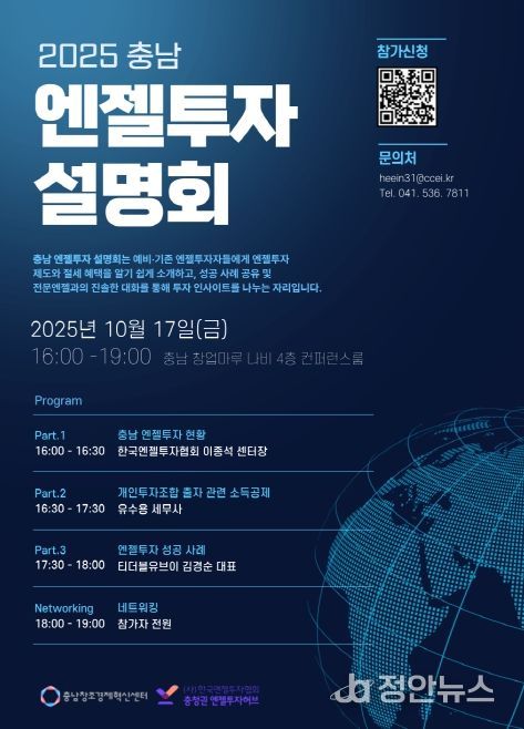 정안뉴스 황도연 기자 | (재)충남창조경제혁신센터는 도내 (예비)엔젤투자자 및 개인투자조합 출자자를 대상으로 ‘2025년 충남 엔젤투자 설명회’ 참가자를 모집한다고 밝혔다.