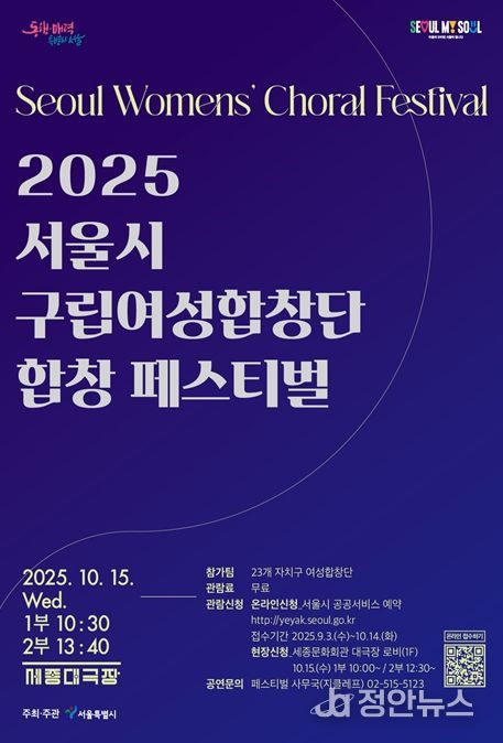 정안뉴스 안정주 기자 | 서울시는 깊어가는 가을을 맞아 오는 10월 15일 오전 10시 30분부터 세종문화회관 대극장에서 '2025 서울시 구립여성합창단 합창 페스티벌'을 개최한다. 이번 페스티벌에는 서울시 23개 자치구 여성합창단 700여 명이 무대에 올라, 아름다운 화음으로 시민들에게 잊지 못할 감동과 따뜻한 추억을 선사할 예정이다.
