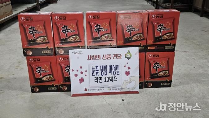 정안뉴스 안정주 기자 | 동두천시 상패동 행정복지센터는 눈꽃 냉삼 미성집이 관내 저소득 가구를 위해 라면 10박스를 기탁했다고 밝혔다.
