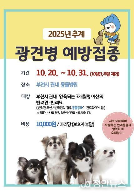 정안뉴스 안정주 기자 | 부천시는 10월 20일부터 31일까지 토요일과 일요일을 제외한 평일에 관내 동물병원 71곳에서 ‘추계 광견병 예방접종’을 실시한다.