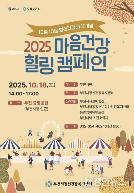 정안뉴스 안정주 기자 | 부천시는 부천시정신건강복지센터와 함께 2025년 정신건강의 날(10월 10일)을 기념해 10월 18일 오후 2시부터 부천중앙공원에서 ‘2025 마음건강 힐링캠페인’을 연다.