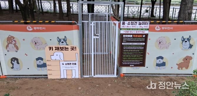 정안뉴스 안정주 기자 | 동두천시는 반려견과 시민이 함께 어울릴 수 있는 반려동물 문화공간을 조성하기 위해 강변로 156(강변근린공원 내)에 반려견 간이놀이터(이동식 울타리)를 설치하고 시범운영에 들어갔다고 밝혔다.