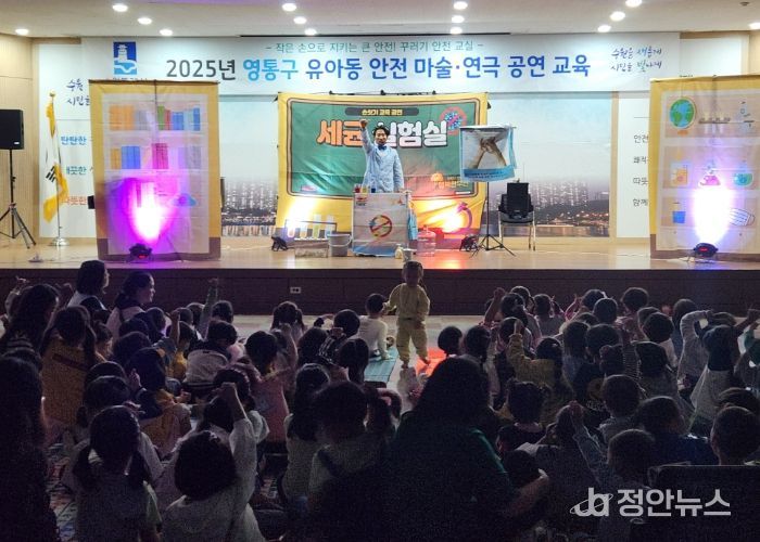 정안뉴스 안정주 기자 | 수원시 영통구는 2025. 10. 13. 영통구청 대회의실에서 관내 유아를 대상으로 안전한 위생 습관을 형성하기 위한 ‘찰리박사의 세균실험실’ 체험형 안전마술·연극 공연 교육을 실시했다.
