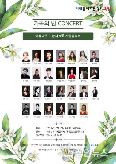 정안뉴스 안정주 기자 | 고양특례시가 후원하고, (사)한국예술문화단체총연합회 고양지회가 주최하며 (사)한국음악협회 고양지부가 주관하는 ‘2025 가곡의 밤 – 아름다운 고양시 8경(景) 가을 음악회’가 오는 16일 오후 7시 30분, 고양아람누리 아람음악당에서 개최된다.