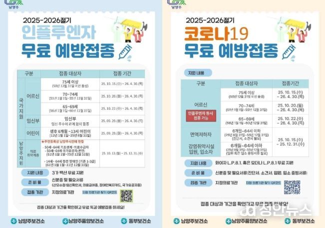 정안뉴스 안정주 기자 | 남양주시는 9월 22일부터 내년 4월 30일까지 ‘2025-2026절기 코로나19·인플루엔자 예방접종 사업’을 추진한다고 밝혔다.