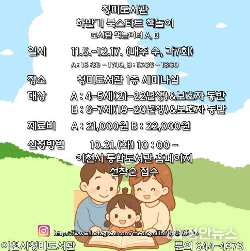 정안뉴스 안정주 기자 | 이천시 청미도서관은 오는 11월 5일부터 12월 17일까지, 유아와 보호자를 대상으로 ‘하반기 북스타트 책놀이’ 프로그램을 운영한다.