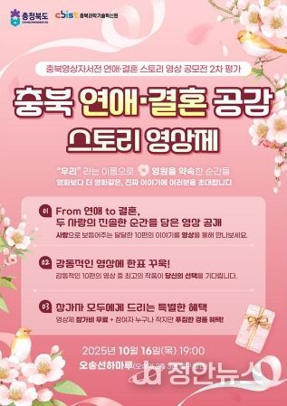 정안뉴스 황은경 기자 | 충북도는 오는 10월 16일 오후 7시, 오송 선하마루에서 ‘충북 연애·결혼공감 스토리 영상제’를 개최한다고 밝혔다.