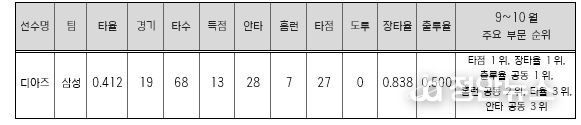 9~10월 MVP로 선정된 디아즈에게는 상금 300만원과 트로피가 전달될 예정이다.