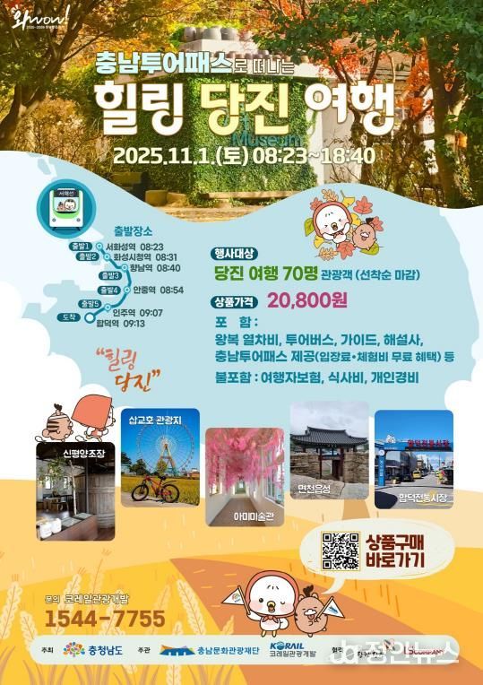 정안뉴스 황도연 기자 | 당진시는 충청남도, 충남문화관광재단, 코레일관광개발과 협력해 충남투어패스로 떠나는‘힐링 당진 여행’ 2차 프로그램을 오는 11월 1일 운영한다고 14일 밝혔다.