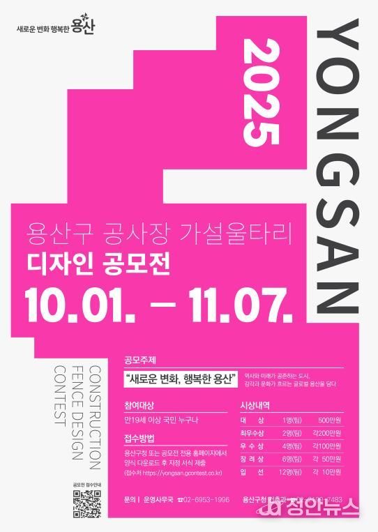 정안뉴스 안정주 기자 | 서울특별시 용산구는 획일적인 공사장 가림막을 시민의 창의적인 아이디어로 탈바꿈시켜 도시 일상에 활력을 더하고자 '2025 용산구 공사장 가설울타리 디자인 공모전'을 개최한다고 밝혔다.