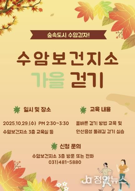 정안뉴스 안정주 기자 | 안산시 상록수보건소 수암보건지소는 지역 주민의 건강증진을 도모하기 위해 ‘수암 가을 걷기 교실’ 참가자를 모집한다고 14일 밝혔다.