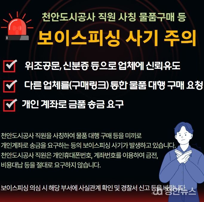 정안뉴스 황도연 기자 | 천안도시공사가 최근 공사 직원을 사칭한 보이스피싱 사례가 발생함에 따라 피해 예방을 위한 주의를 당부했다.