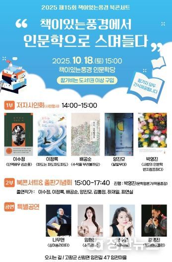 올해로 15번째를 맞는 이번 북콘서트는 저자사인회, 북토크, 출판기념회가 함께 진행돼 작가와 독자가 직접 마주 앉아 이야기를 나누는 교류의 장으로 행사에는 제4회 고창신재효문학상 수상자인 이수정 작가(『단역배우 김순효』), 이정록 작가(『파도는 파도파도파도』), 배공순 작가(『우리, 수작할까요』), 양진모 작가(『달빛무대』) 등 문학계에서 활발히 활동 중인 작가들이 함께한다. 이들은 각자의 작품 세계를 소개하고 창작의 여정을 들려주며, 독자들과의 질의응답을 통해 문학의 의미를 공유할 예정이다.