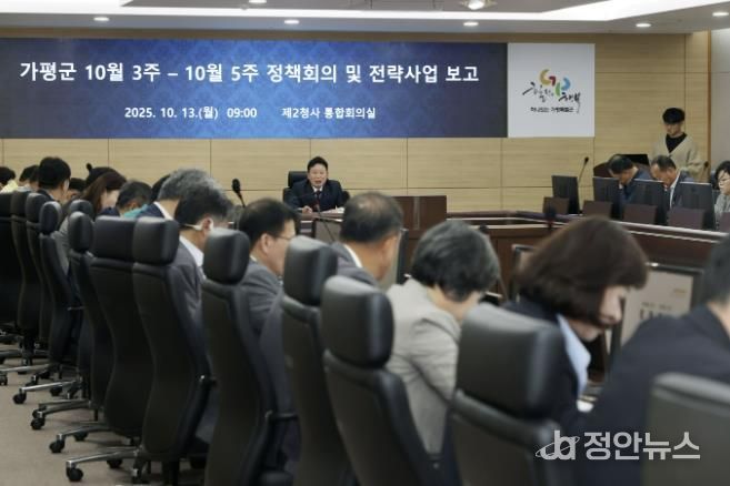 정안뉴스 안정주 기자 | 가평군은 13일 2청사 통합회의실에서 ‘2025년 50대 전략사업 3분기 보고회’를 열고 주요 현안사업 추진상황을 점검하며 군정 운영 방향을 공유했다.