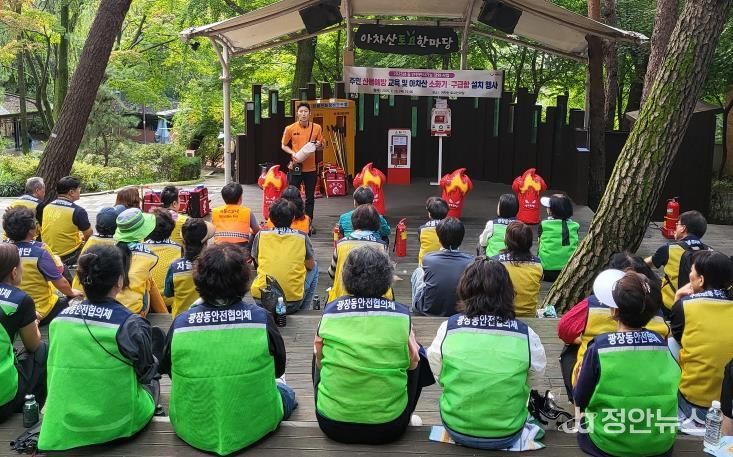 정안뉴스 안정주 기자 | 광진구는 지난 9월 25일 아차산 토요한마당과 등산로 일대에서 지역주민 80여 명이 참석한 가운데 등산로 안전시설 설치 및 산불 예방 교육 행사를 실시했다.