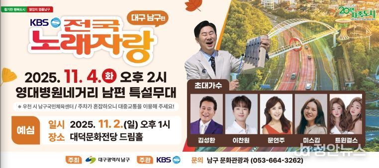 정안뉴스 안정주 기자 | 대구 남구는 국내 최장수 인기 프로그램인 KBS 전국 노래자랑 ‘대구 남구편’이 오는 11월 4일 오후 2시, 영대병원네거리 남편 특설무대에서 열린다고 밝혔다.