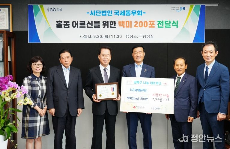 정안뉴스 안정주 기자 | 서울 성북구가 지난 9월 30일 백미 800㎏(4㎏들이 200포)을 기부한 (사)국세동우회 자원봉사단(단장 정환만)에게 감사장을 수여하며 나눔의 자리를 가졌다.