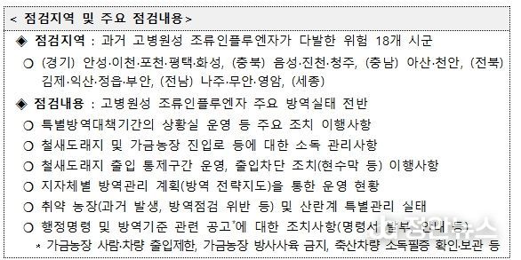이번 점검은 지난 9월 12일 경기도 파주에서 과거보다 다소 이른 시기에 고병원성 조류인플루엔자가 가금농장에서 발생했고, 10월부터 겨울 철새가 본격 도래하면서 국내 추가 발생 가능성이 높아짐에 따라 선제적으로 농식품부, 행정안전부, 농림축산검역본부, 시도 관계관 합동으로 점검반을 구성하여 실시하는 것이다.