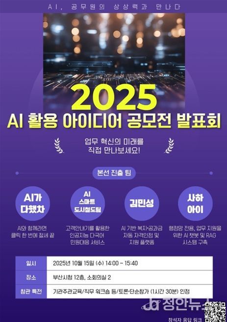 정안뉴스 황정혜 기자 | 부산시는 오늘(15일) 오후 2시, 시청 12층 소회의실2에서 '2025년 에이아이(AI) 활용 아이디어 공모전 발표회'를 개최한다고 밝혔다.