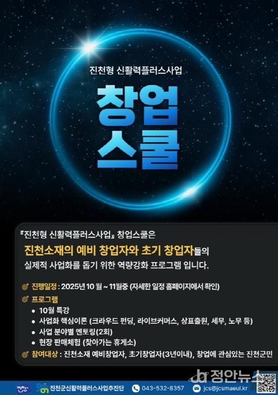 정안뉴스 황은경 기자 | 충북 진천군 신활력플러스사업 추진단은 오는 11월까지 약 2개월간 지역 창업 역량을 높이고, 창업 꿈을 현실로 만드는 ‘진천형 신활력플러스사업 창업스쿨’을 본격 운영한다고 15일 밝혔다.