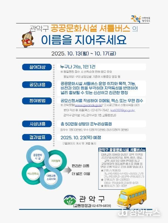 아울러 구는 오는 17일까지 공공문화시설 셔틀버스 명칭을 공모한다. 지역 제한없이 누구나 응모할 수 있으며 셔틀버스의 목적과 비전을 담아낸 이름을 지어 담당자 이메일또는 팩스로 제출하면 된다. 당선작은 10월 23일 개별 통지되고, 구청 홈페이지에도 게시될 예정이다.