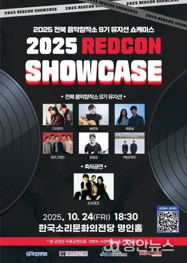 정안뉴스 안정주 기자 | (재)전북특별자치도 콘텐츠융합진흥원은 ‘2025 전북 레드콘 음악창작소 9기 뮤지션 쇼케이스’를 오는 24일 오후 6시 30분, 한국소리문화의전당 명인홀에서 개최한다.