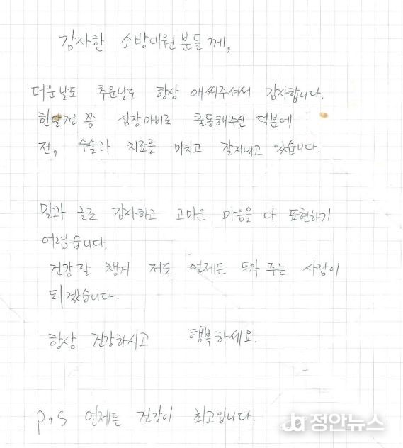 김원형 구급대원은 “당연히 해야 할 일을 했을 뿐인데 이렇게 감사 인사를 받아 오히려 부끄럽다”며 “A씨가 건강을 회복하고 퇴원하셨다는 소식을 들으니 뿌듯하다”고 말했다.