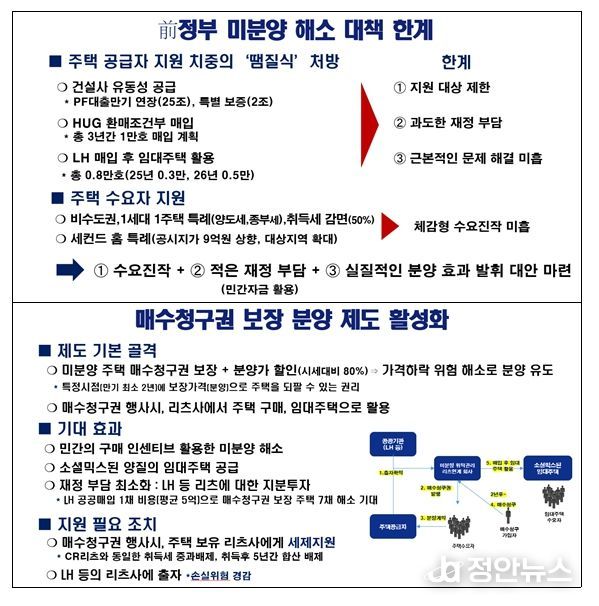 안 의원은 재정 부담은 최소화하면서도 분양 효과를 높일 수 있는 실질적 대안으로 ‘매수청구권 보장 분양제도’를 제안했다. 이 제도는 ▲미분양 주택의 분양가를 시세의 80% 수준으로 할인하고, ▲수분양자에게 매수청구권을 부여해 가격 하락 위험을 완화함으로써 민간 수요를 유인하는 방식이다.