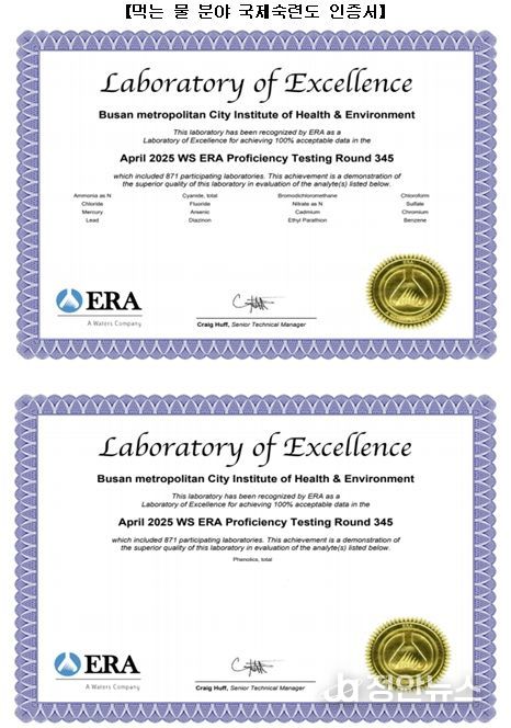 정안뉴스 황정혜 기자 | 부산시 보건환경연구원은 먹는 물 분야 분석 능력 검증을 위해 참가한 미국 환경자원협회(ERA) 주관 국제숙련도 평가에서 전 항목 '만족' 판정을 받아 '최고 등급' 인증을 획득했다고 밝혔다.