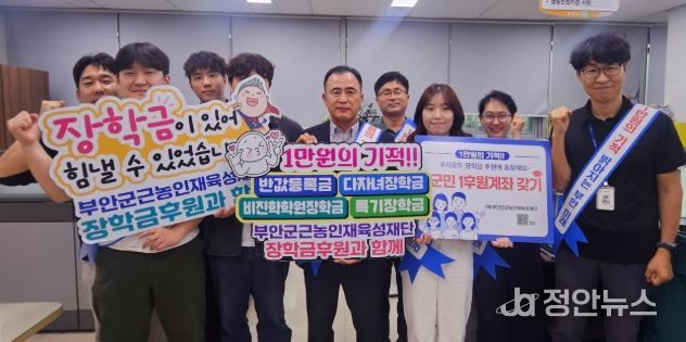 정안뉴스 안정주 기자 | 부안군 농업정책과는 지난 15일, 부안군근농인재육성재단이 추진 중인 ‘장학금 1군민 1후원계좌 갖기’ 캠페인에 동참했다.