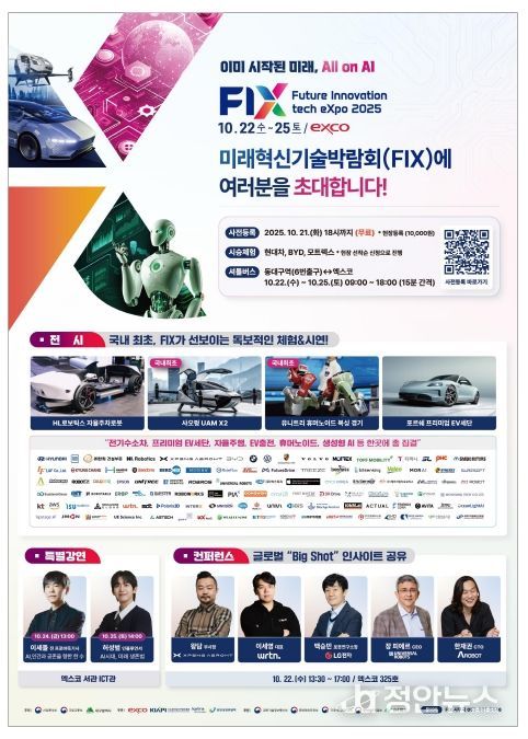 정안뉴스 안정주 기자 | ‘이미 시작된 미래, All on AI’를 주제로 ‘2025 미래혁신기술박람회’가 10월 22일부터 25일까지 4일간 대구 엑스코에서 열린다.