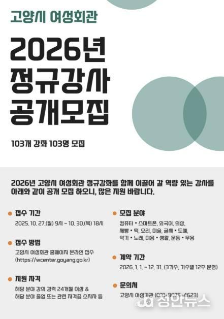 정안뉴스 안정주 기자 | 고양특례시 여성회관에서 2026년 정규강좌 운영을 위한 정규강사진을 공개 모집한다.