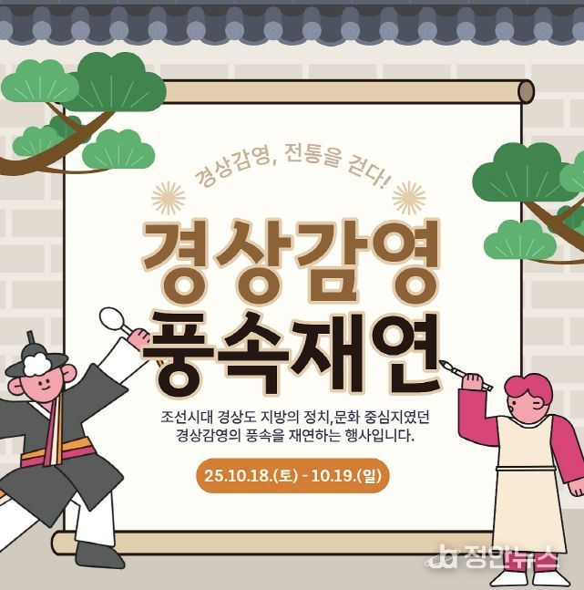 정안뉴스 안정주 기자 | 대구광역시는 10월 18일부터 19일까지 이틀간 경상감영공원 일원에서 관아의 옛 의식과 전통공연을 선보이는 ‘2025 경상감영 풍속재연’ 행사를 개최한다.